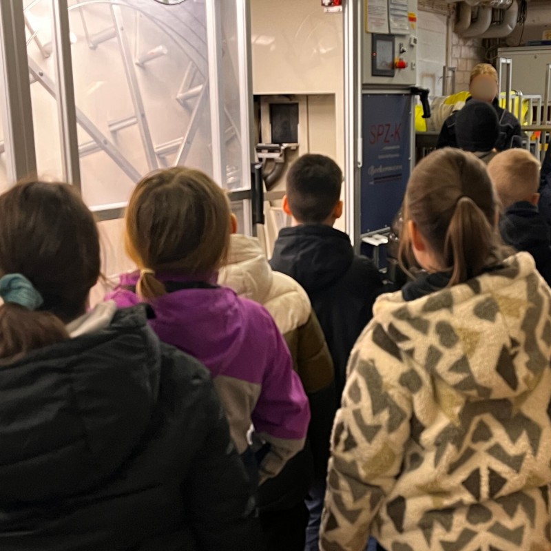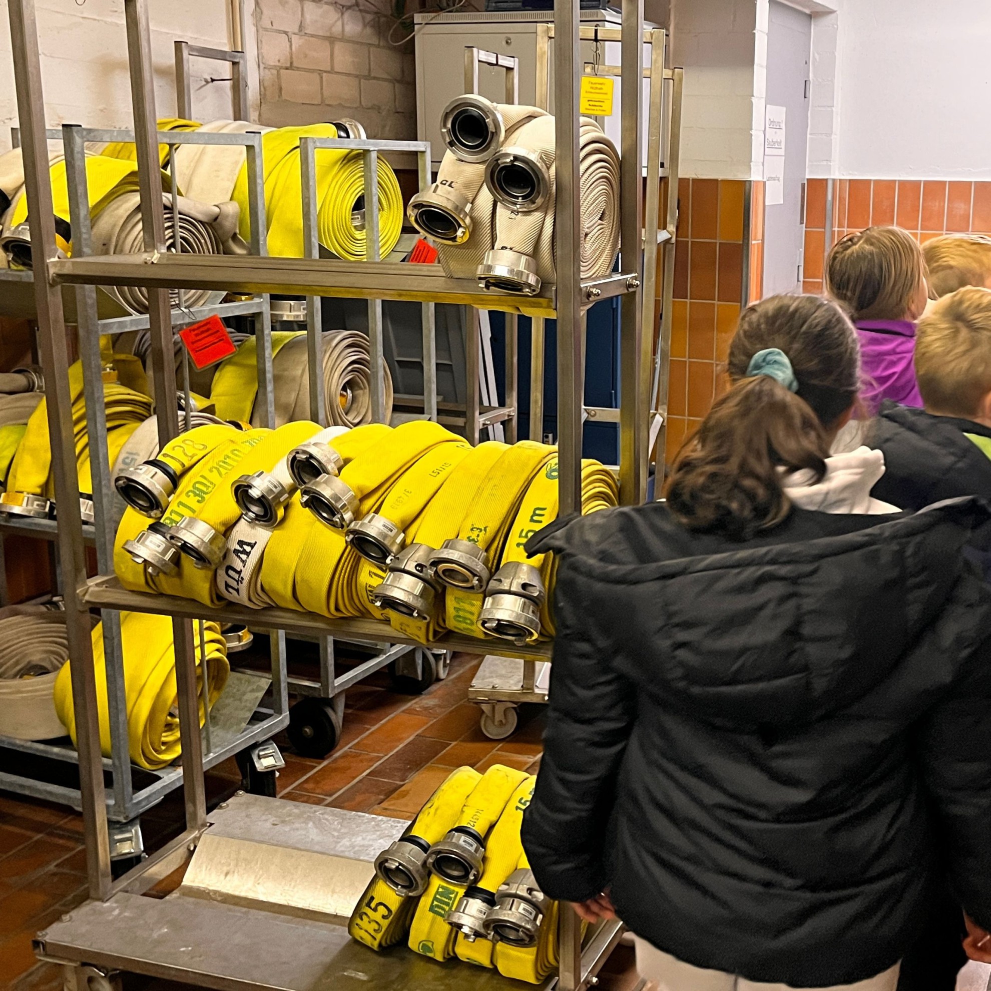 Im Anschluss erkundeten die Kinder die Feuerwache. Sie konnten die Einsatzzentrale, die Spinde und verschiedene Ausrüstungsbereiche besichtigen – besonders spannend war die große Schlauchwaschanlage, in der die Schläuche nach einem Einsatz gereinigt und geprüft werden.