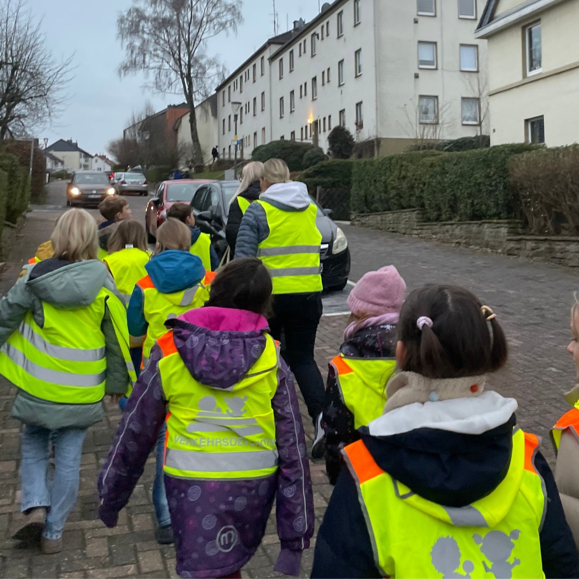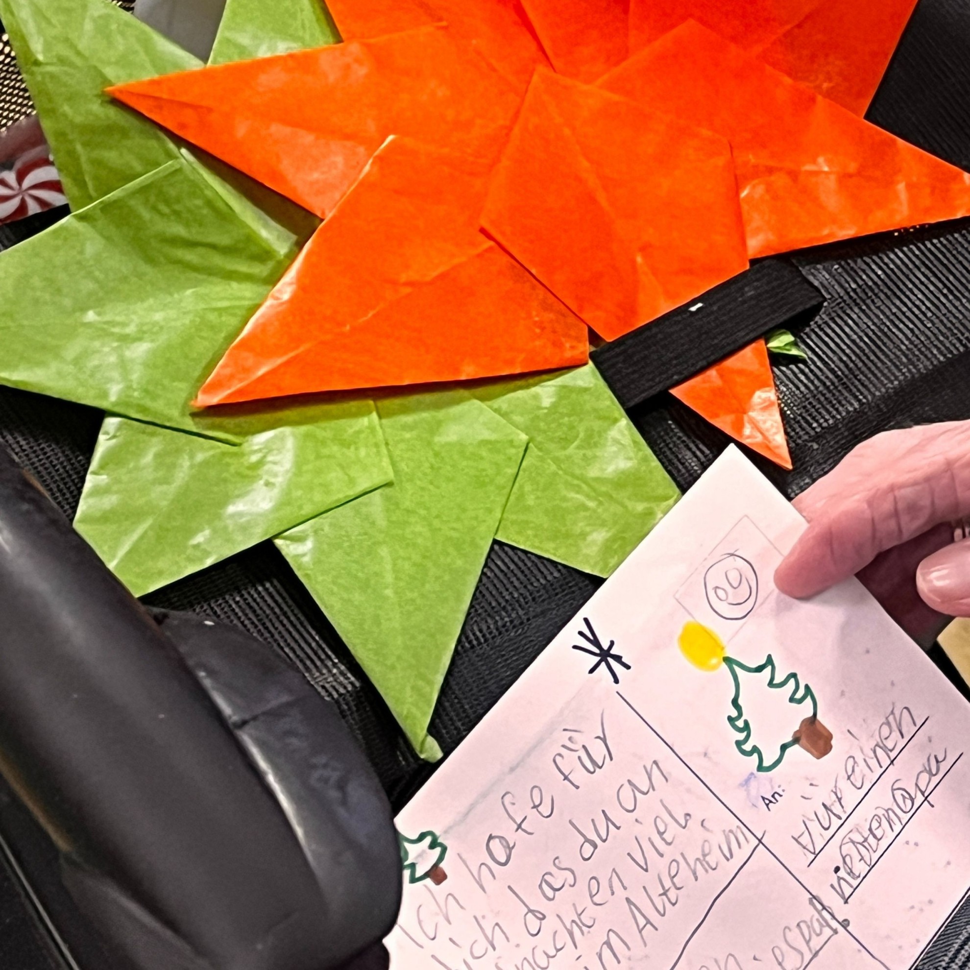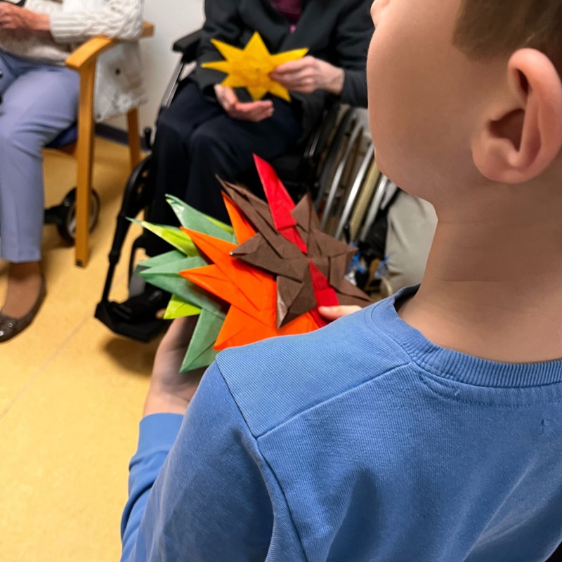 Zu einem vorweihnachtlichen Miteinander besuchten einige Kinder aus der Hunde- und Waschbärenklasse die Pflegeeinrichtung Haus August von der Twer. In den Wochen zuvor hatten die Schülerinnen und Schüler im Kunstunterricht wunderschöne Sterne aus Transparentpapier gebastelt. Außerdem schrieben mehrere Klassen Weihnachtskarten.