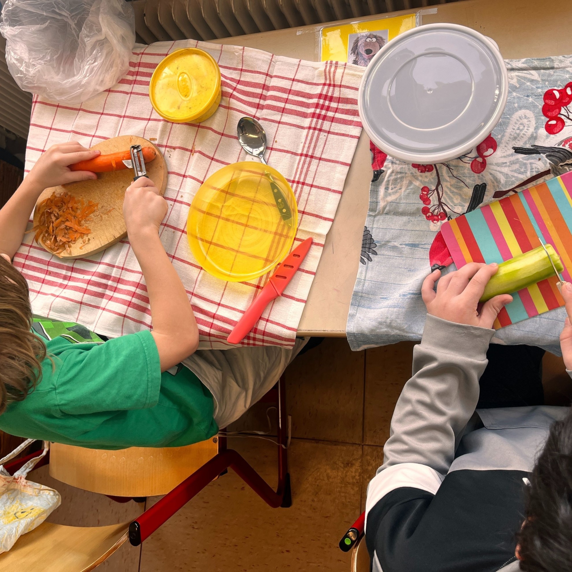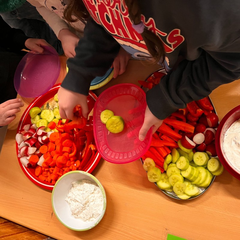 In den vergangenen Wochen haben sich die Kinder der 3. Klassen - die Hunde-, Zebra- und Waschbärenklasse - ihren Ernährungsführerschein erarbeitet. Die Kinder bereiteten verschiedene kleine Gerichte zu, lernten den Umgang mit Lebensmitteln und beschäftigten sich zugleich mit Grundlagen wie der Ernährungspyramide und einer ausgewogenen Mahlzeit.
