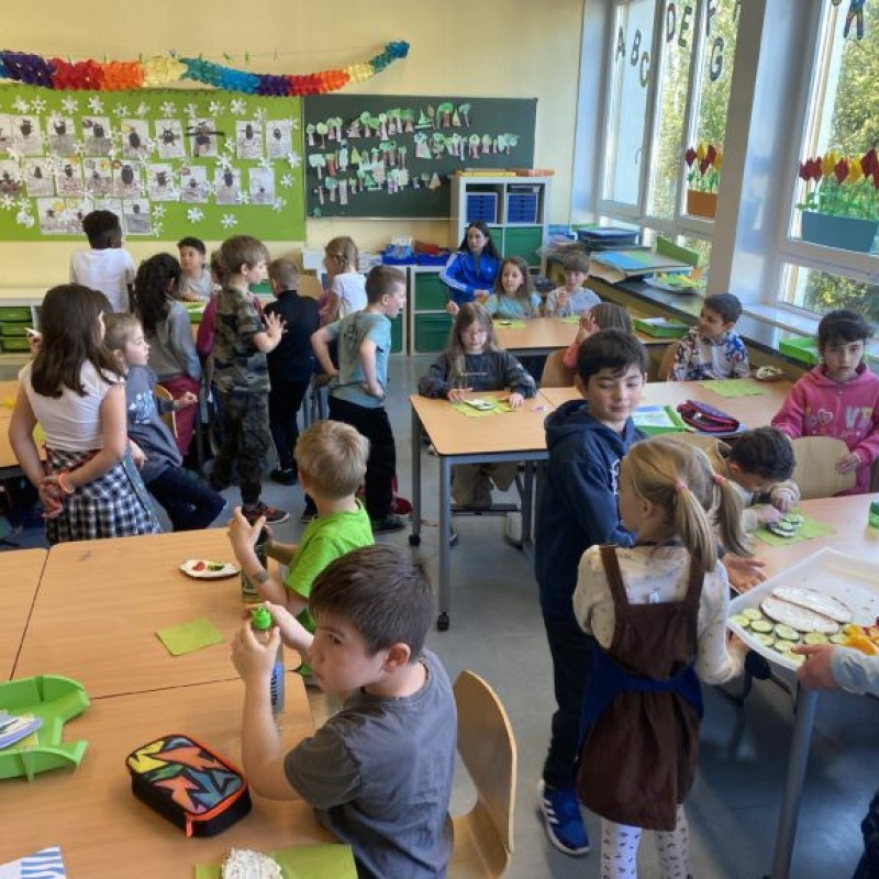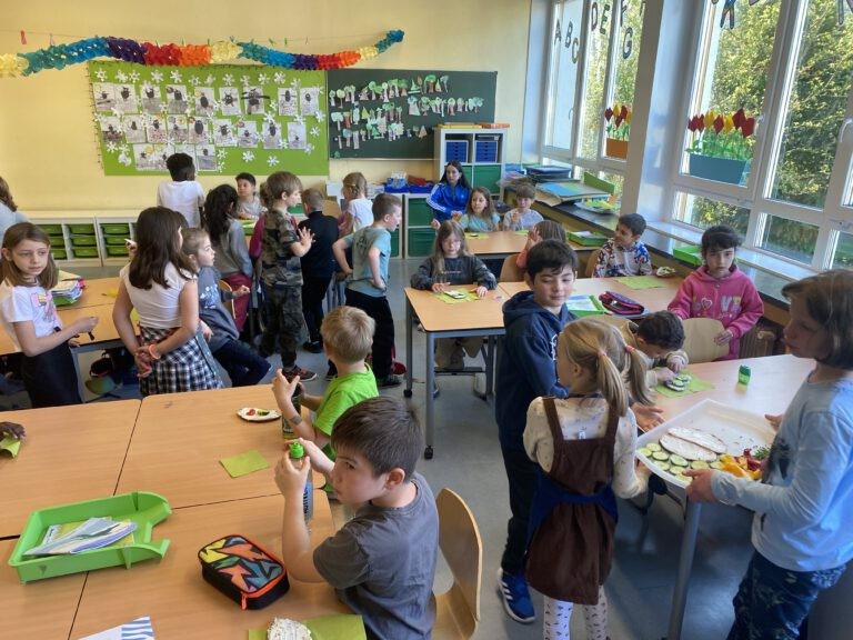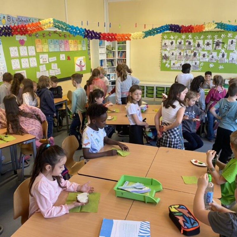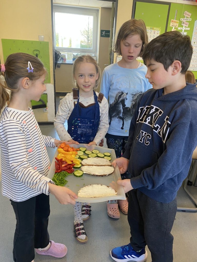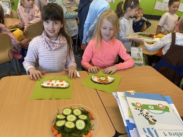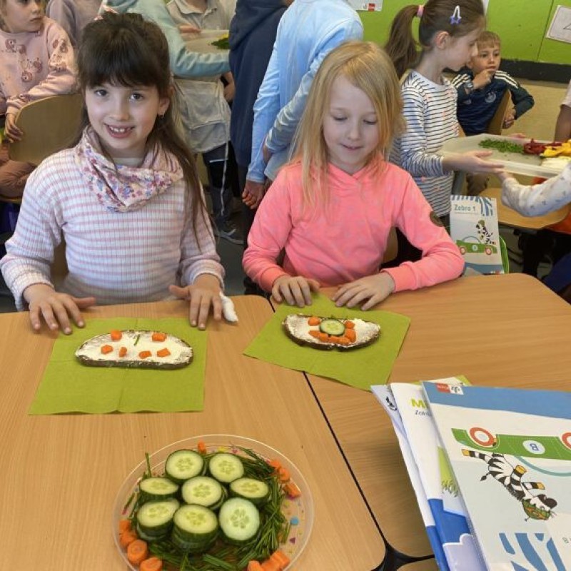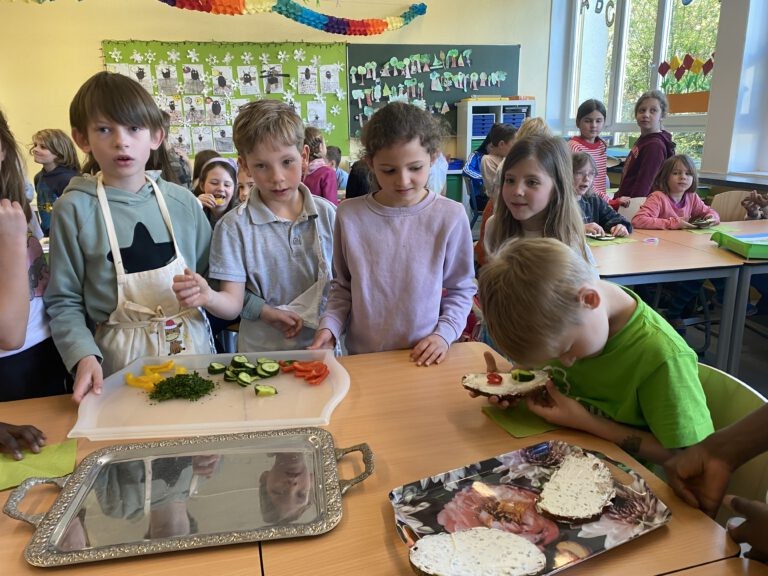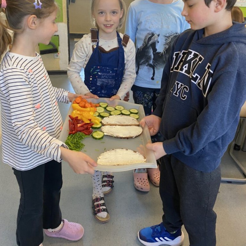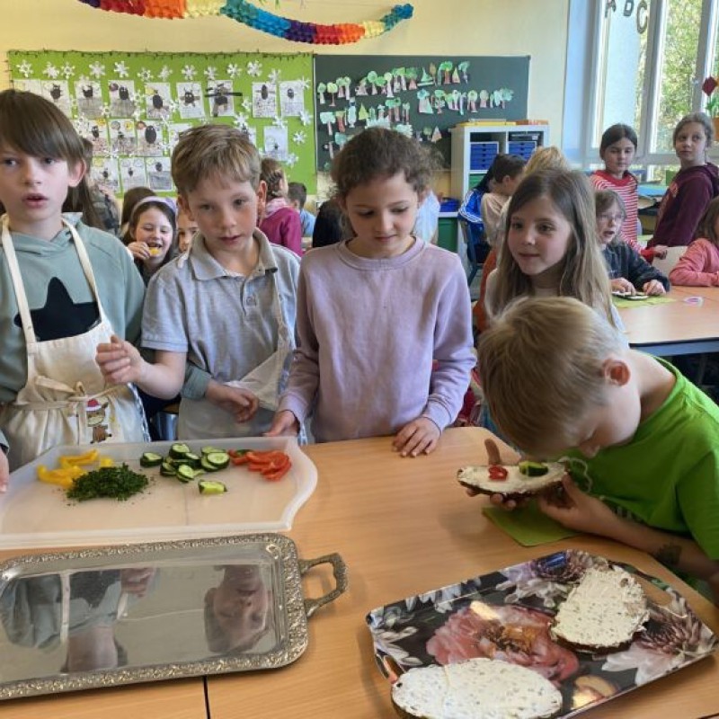 In mehreren Einheiten haben die Drittklässler in den letzten Wochen gelernt, mit frischen Lebensmitteln und Küchengeräten sorgfältig umzugehen. Sie haben geschnitten, geschält, geraspelt, gerührt und natürlich auch gemeinsam gegessen. Zum Abschluss konnten Sie ihre Fähigkeiten bei der Bewirtung der Patenklassen mit einem Buffet für lustige Brotgesichter zeigen.
