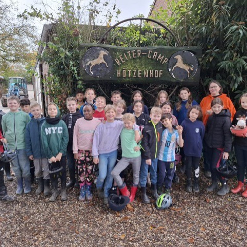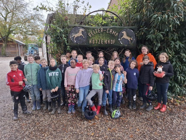 Vom 28.10.2024 bis zum 31.10.2024 sind wir, die 4. Klassen der Lindenschule mit dem Reisebus zum Hötzenhof gefahren. Der Hötzenhof ist ein Reiterhof mit vielen Pferden und Ponys und einem Streichelzoo. Als wir dort angekommen sind, haben wir erstmal alles gezeigt bekommen, danach haben wir unsere Zimmer zugeteilt bekommen. Nachdem wir die Betten bezogen und unser Gepäck in den Zimmern abgeladen haben sind wir spielen gegangen. Es gab einen großen Spielplatz mit einem Hüpfekissen, welches leider fast nie aufgeblasen war, eine nasse Drehwippe, eine Rutsche und vieles mehr. Außerdem gab es eine Strohscheune, eine Fußballhalle, eine Spielscheune und ein Gehege mit Alpakas, Eseln und Ziegen. Im Streichelzoo gab es Kaninchen und Schettlandponys. Um 12 Uhr gab es Mittagessen. Zur Vorspeise gab es immer eine Suppe und nach der Hauptspeise gab es noch einen Nachtisch. Das Essen war immer sehr lecker. Nach dem Essen durften wir statt einer Ruhepause von einer Stunde alles nochmal selbst erkunden gehen. Um 15:30 Uhr hatten wir unsere 1. Reitstunde. Ein Pferd hat leider versucht zu beißen. Das war nicht schön. Das Wetter war eigentlich immer gut. Nach der Reitstunde durften wirspielen gehen oder ins Zimmer gehen.