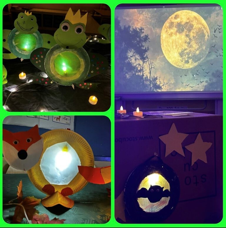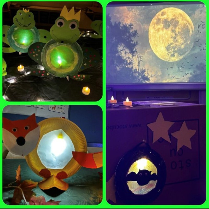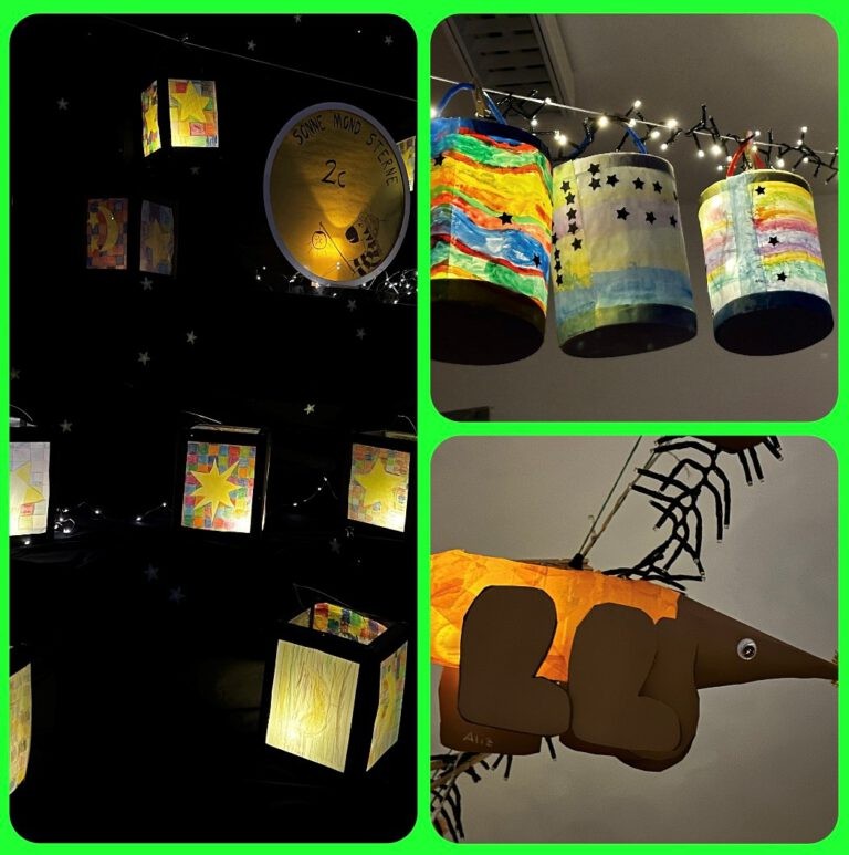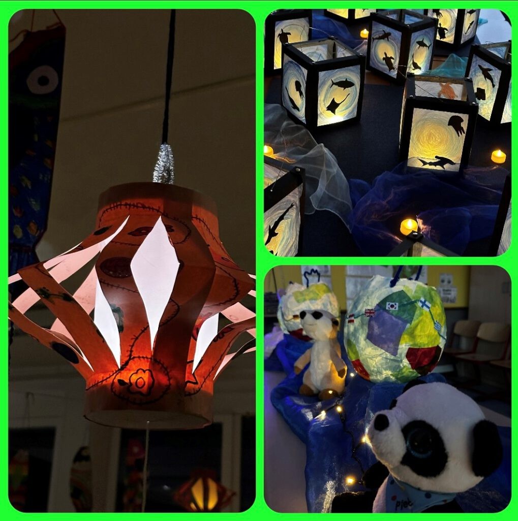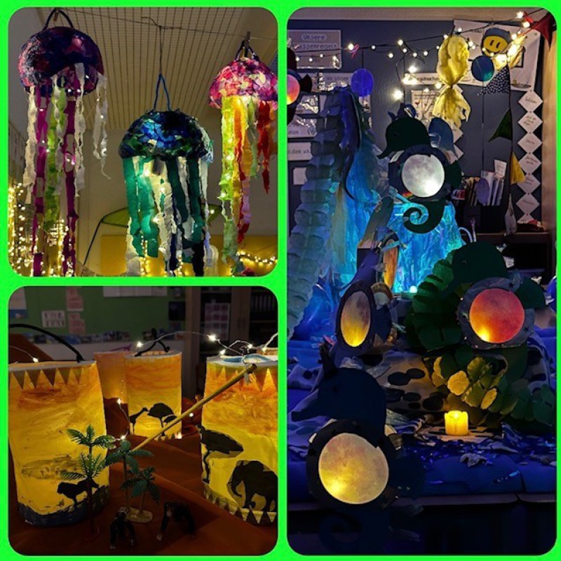 Unsere Laternenausstellung begeisterte Eltern, Kinder und das Kollegium. Liebevoll gestaltete Klassenräume versetzten alle in Unterwasserwelten oder in den Weltraum, in den Wald, an den Froschteich oder an andere Orte.